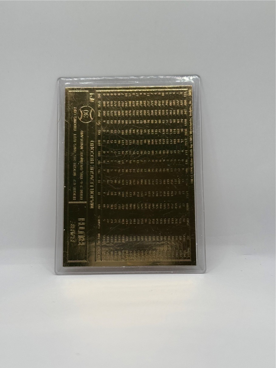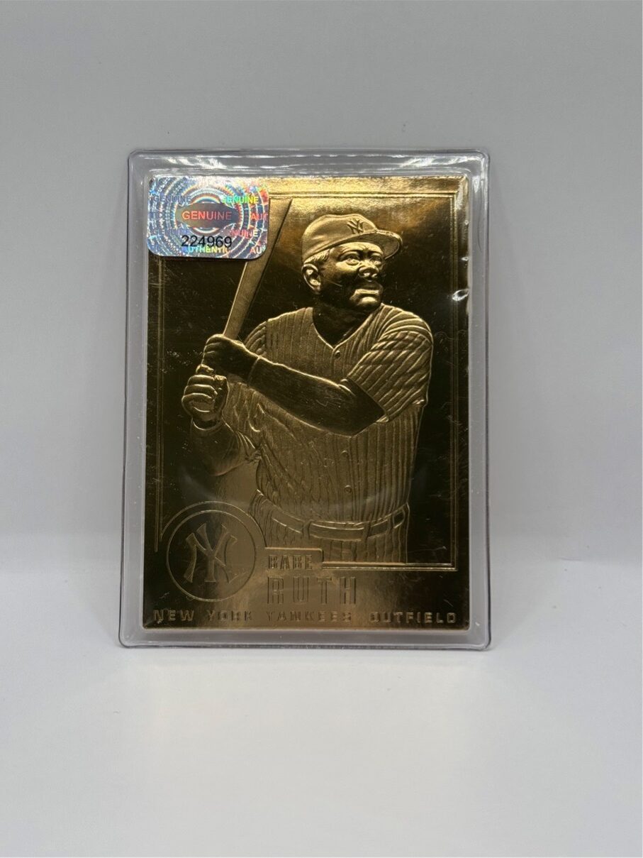The Babe Ruth 1996 Danbury Mint 22kt Gold Card #30 is a commemorative collectors’ piece featuring the legendary New York Yankees Hall of Famer. While marketed as a “22kt gold” item, it consists of a thin layer of 22-karat gold foil over cardstock rather than solid gold.