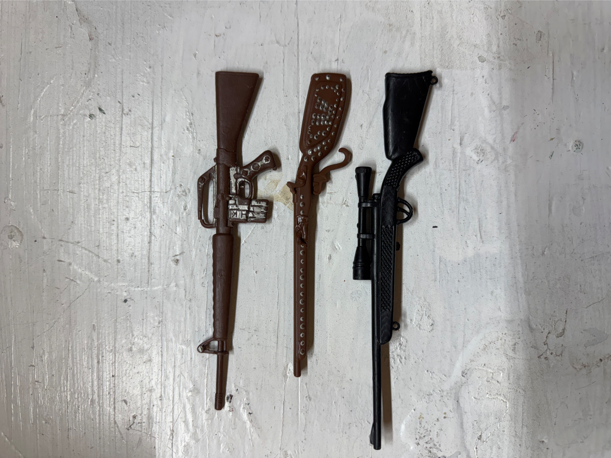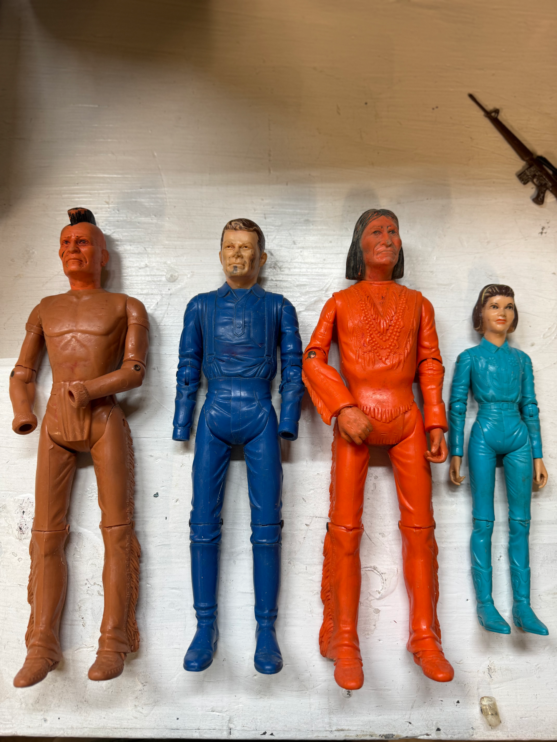 I’m offering a lot of 4 Johnny West Action Figures from Marx toy company. These were mine back in the early 70’s. I do know that they made a lot of these in different series and colors, etc. I had someone do some research and tell me that they thought these four should bring $200 even with the missing pieces, etc. I also have 3 guns that we think are either matches for this series or possibly GI Joe but they come with these figures. I’m only asking $175
